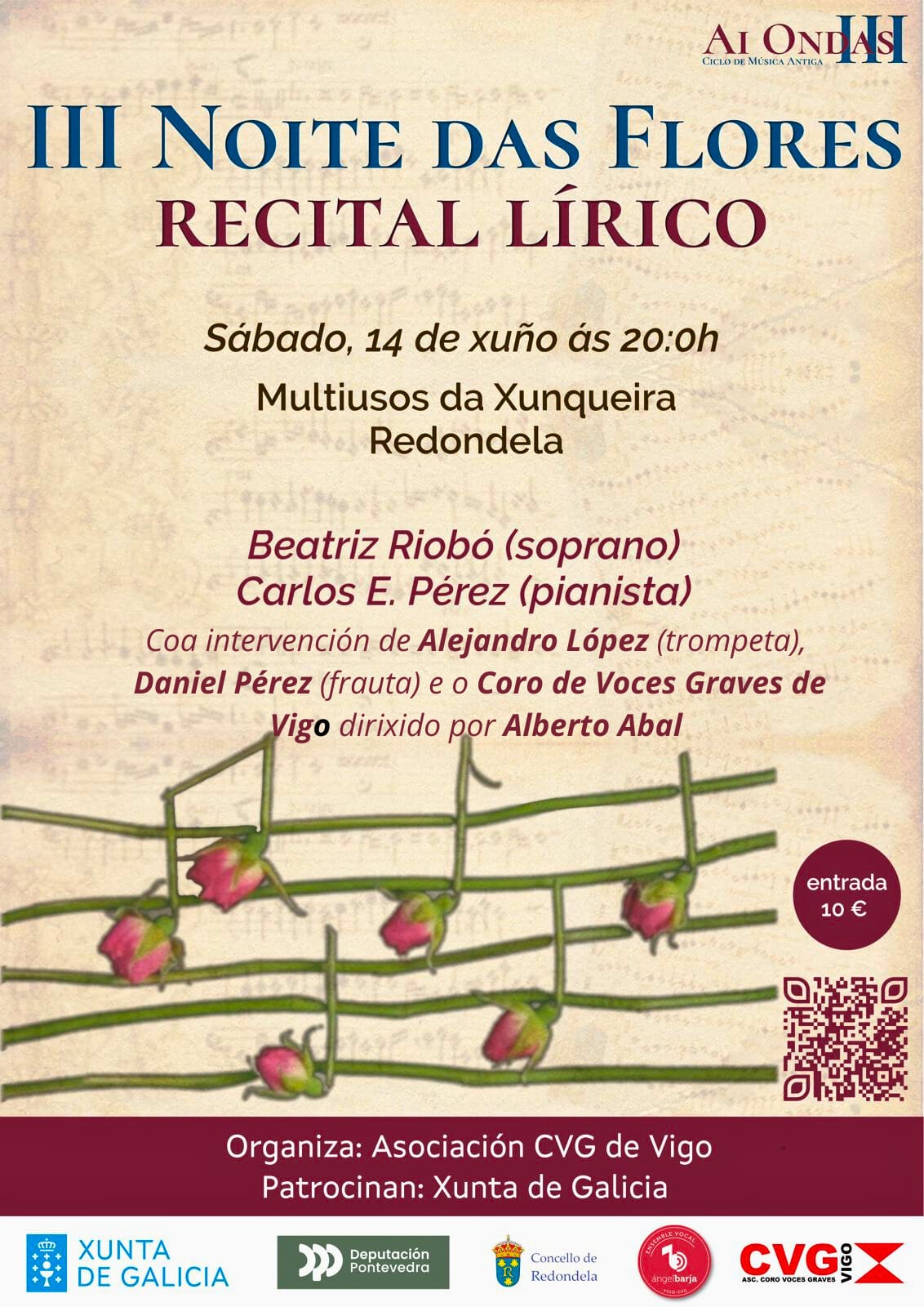 A Asociación CVG de Vigo presenta unha nova edición da Noite das Flores, un recital lírico no que participan a soprano Beatriz Riobó e o pianista Carlos E. Pérez, acompañados de destacados músicos invitados e o Coro de Voces Graves de Vigo, dirixido por Alberto Abal.