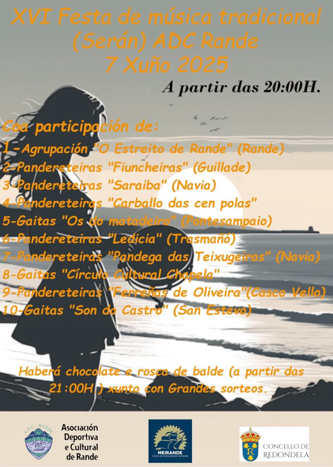 O vindeiro 7 de xuño de 2025, a partir das 20:00 h, celebrarase na parroquia de Rande a décimo sexta edición da Festa de Música Tradicional organizada pola Asociación Deportiva e Cultural de Rande. Este serán contará coa participación de agrupacións de gaitas e pandeireteiras de distintas parroquias e vilas, promovendo a cultura galega a través da música e o baile tradicional.