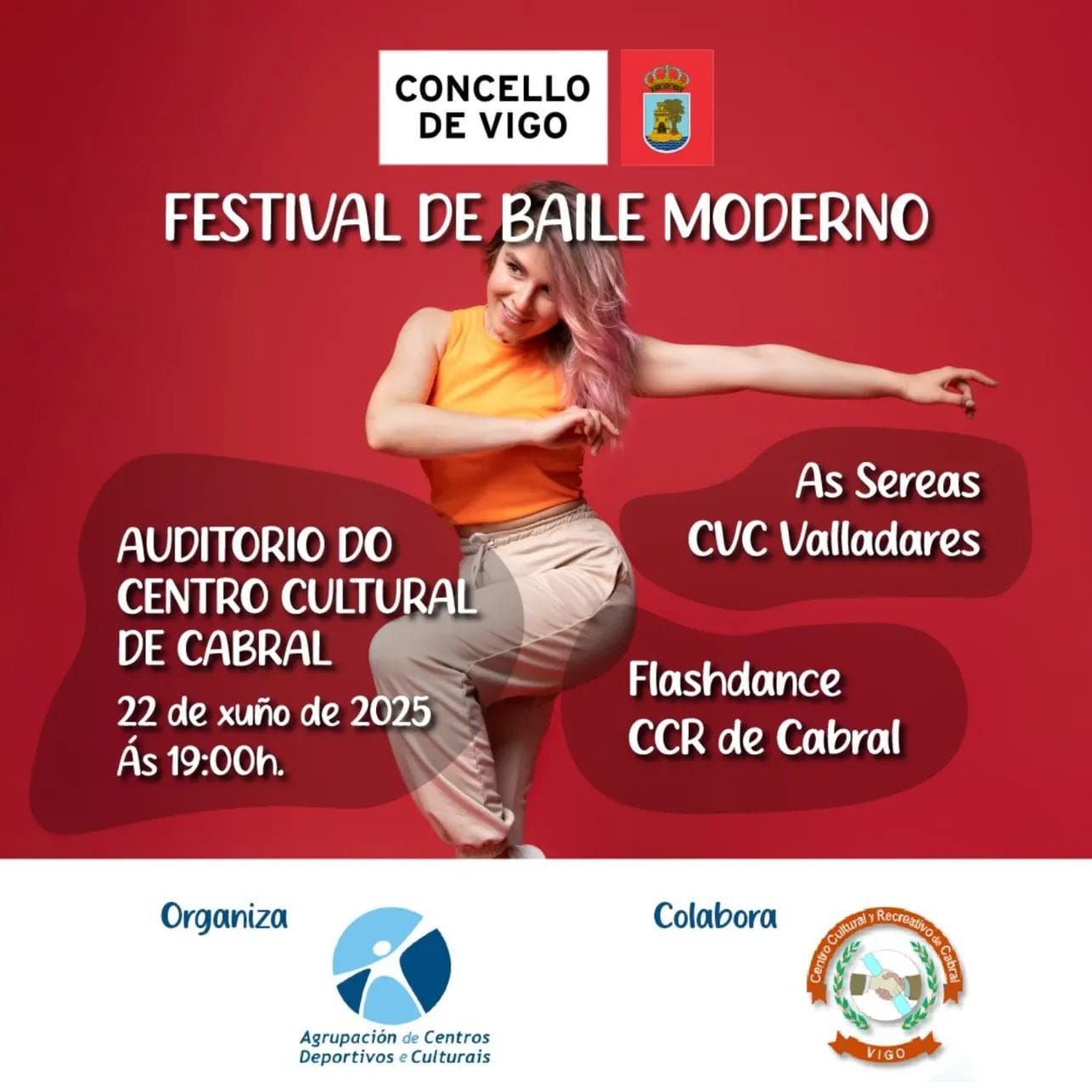 El domingo 22 de xuño la Agrupación de centros culturales organiza el festival de baile moderno que participa nuestro centro de danza Flashdance y el grupo de danza As Sereas del C.V.C.Valladares.