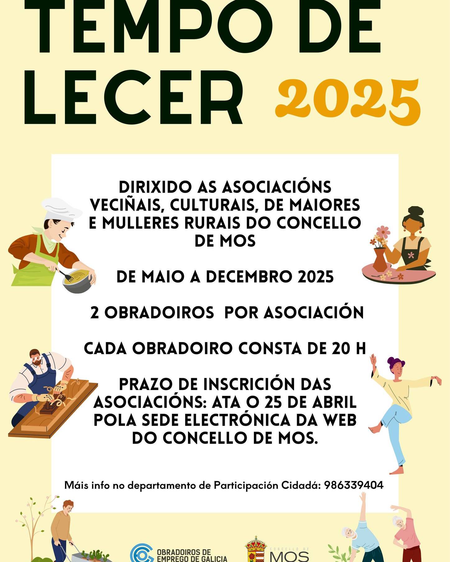 Chega o PROGRAMA “Tempo de Lecer 2025” !!! O concello de Mos a través da concellería de Participación Cidadá, organiza unha serie de actividades dirixidas a poboación Xeral maior de 14 anos no ámbito da educación non regrada e actividades de ocio e lecer a través de distintos obradoiros. OBXECTIVO: fomentar o asociacionismo na vida sociocultural e comunitaria, proporcionando alternativas de lecer no seu medio máis próximo e facilitándolle á veciñanza a posibilidade de ocupar o seu tempo de lecer con actividades de ocio de lecer ou formativas adaptadas as súas posibilidades. Tempo de Lecer é un programa moi demandado polas asociacións do noso municipio, conta xa con 16 anos de traxectoria, no que anualmente se benefician unhas 20 asociacións e máis de 450 persoas que pertencen ao colectivo de asociacións veciñais, culturais, de maiores e mulleres rurais, que participan en obradoiros temáticos que favorecen a participación e a cooperación social. Mediante esta convocatoria ofertaranse: - un total de 44 obradoiros - nos que poderán participar ata 22 asociacións. - Cada asociación poderá solicitar a razón de 2 dous obradoiros de 20 h cada un, - cun número de participantes entre 12 e 25.