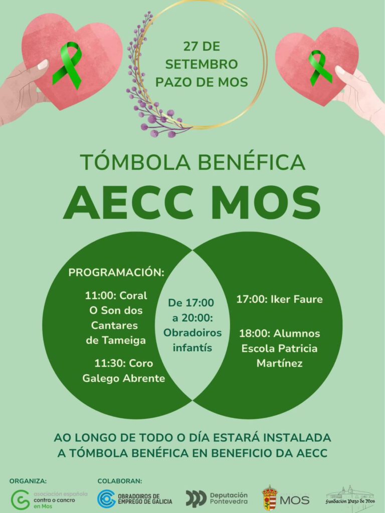 O 27 de setembro, o Pazo de Mos acollerá unha tómbola benéfica en favor da Asociación Española Contra o Cancro. Programa: 11:00 – Coral O Son dos Cantares de Tameiga 11:30 – Coro Galego Abrente 17:00 a 20:00 – Obradoiros infantís 17:00 – Iker Faure 18:00…