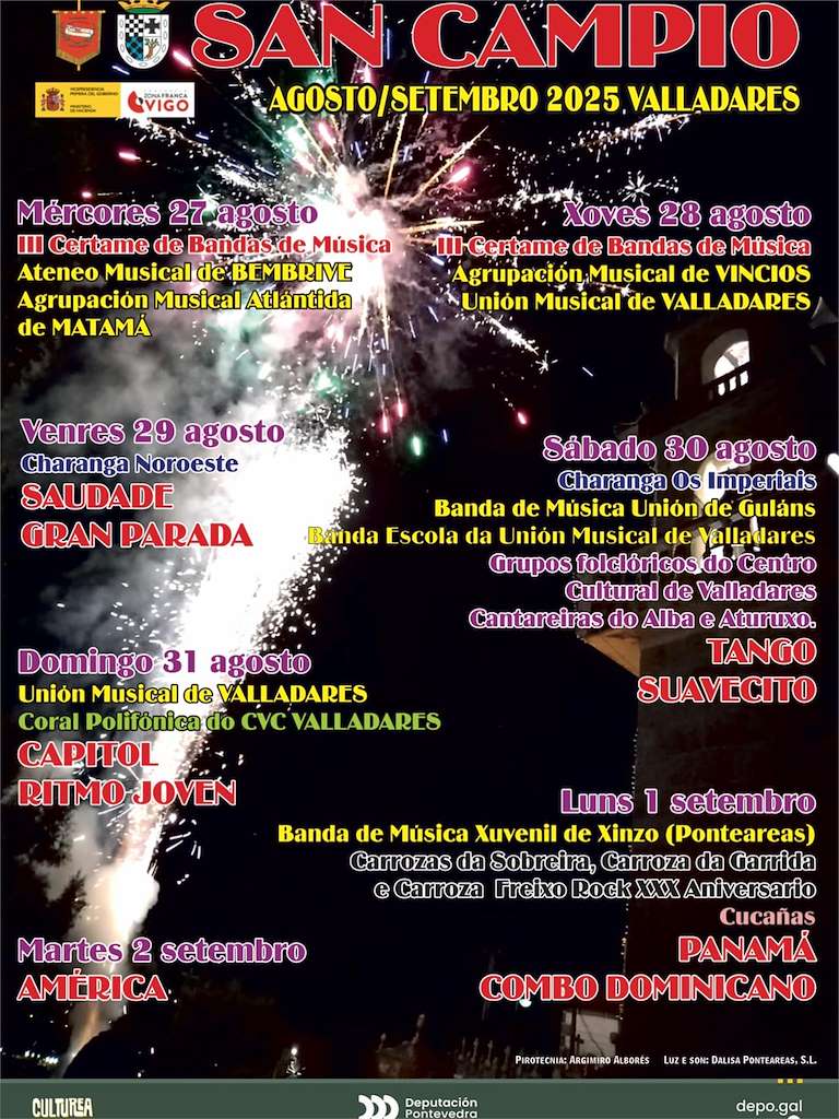 , valladaresMiércoles 27 de Agosto, comienzan las fiestas en honor a San Campio en Valladares con la celebración del III Certame de Bandas de Música con la participación de Ateneo Musical de Bembrive y Agrupación Musical Atlántica de Matamá. Jueves 28, en esta…